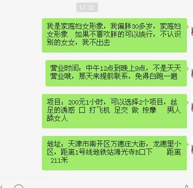 信息分类:楼凤兼职 地区:天津-市区 信息来源:自己 小姐数量:1 小姐年龄:30多 小姐素质:好 小姐外形:丑胖 服务项目:都有 营业时间:提前联系 环境设备:好 安全评估:安全回来了 详细地址:本段信息已隐藏,请先登陆。点击登陆 , 或者 点击注册 联系方式:本段信息已隐藏,请先登陆。点击登陆 , 或者 点击注册 综合评价:不错 详细介绍: 自己说是良家,服务不错 楼凤兼职